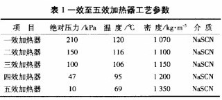相同類型的差壓變送器,一效至四效加熱器液位變送器測(cè)量準(zhǔn)確,而五效加熱器液位變送器液位出現(xiàn)異常波動(dòng),一效至五效加熱器工藝參數(shù)如表1所示。從液位變送器測(cè)量原理可以得出,與液位測(cè)量有關(guān)的工藝參數(shù)有壓力、溫度、密度及被測(cè)介質(zhì)等。
