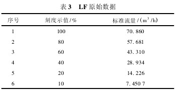 玻璃管轉子流量計具有結構簡單、工作可靠、線性刻度、讀數(shù)直觀等特點,屬于變面積式流量計的一種,在工業(yè)計量中應用廣泛。一般出廠時對玻璃管粗細均勻程度要求較高,但其粗糙的刻線使得其在使用中誤差非常大。由于玻璃管自身是錐體的,所以無法均勻分割刻線以達到與標準流量相接近的目的。為了達到預期使用目標,本著方便快捷、經濟合理的原則,本文以LZB-50和LF百分比型兩種流量計為例,采用鐘罩式氣體流量標準裝置,介紹如何把刻度示值無限接近地修正到標準流量。 1.相關概念 刻度示值:玻璃管或坐標紙上標刻的讀數(shù),單位為m3/h,有時也用百分比。 標準流量:在101325Pa,20℃狀態(tài)下的流量,單位為m3/h。 引用誤差:(刻度示值-標準流量)/量程上限×100%。 2.LZB-50型流量計 (1)把轉子流量計按玻璃管上的刻度示值做一遍檢定,得到如表1所示數(shù)據(jù),從中可以看出刻度示值為“100”和“80”時的引用誤差非常大,已經無法正常使用(JJG257—2007《浮子流量計檢定規(guī)程》中規(guī)定引用誤差最大為5%)。 (2)用坐標紙測量一下玻璃管上刻度示值“100”與“80”之間有多少小格(1小格=1mm),測得“100”與“80”之間有66mm。 (3)把刻度示值“100”對應的標準流量105.080m3/h減去刻度示值“80”對應的標準流量85.764m3/h,計算出“100”與”80”之間相差的標準流量。即 105.080-85.764=19.316m3/h (4)計算出刻度示值“100”與“80”之間每毫米對應多少m3/h。即 19.316/66=0.29266m3/h (5)以標準流量105.08m3/h為基準,找出標準流量為100m3/h時對應到玻璃管上的位置。即 105.08-100=5.08m3/h 5.08/0.29266=17.4mm (6)由(5)中的兩個式子可以得出,標準流量為100m3/h和105.080m3/h時在玻璃管上的位置相差17.4mm。在坐標紙上找一起始刻線,并在玻璃管左側與“100”橫豎對齊并固定好,從坐標紙的起始刻線處向下移動17.4mm,該位置就是標準流量為100m3/h時的位置,在此處畫一橫線作標記,記數(shù)為100。以后把浮子升到該位置就可較為正確地得到100m3/h的標準流量。 7)上述步驟只得到刻度示值“100”的修正,同理可以得出80與60,60與40,40與20相差的距離,通過向下調整而得到所需修正值。如果我們認為某點滿足使用不用修正,那么就可以對照玻璃管上的刻線直接畫過來。 (8)修正完所有刻度示值后,按照坐標紙上的刻度示值重新檢定。得到如表2所示數(shù)據(jù),從中可看出刻度示值為“100”與“80”時的引用誤差已變?yōu)?.28%,0.39%,明顯優(yōu)于修正前。 3.LF百分比型流量計 按玻璃管上的百分比刻度做其對應的標準流量,如表3所示。從表3可看出,假如需要60m3/h、50m3/h、40m3/h、30m3/h的標準流量時,我們是無法較為正確把浮子調到玻璃管上其對應的位置的,因此需要通過下列步驟得到我們想要的結果。 (1)根據(jù)上述數(shù)據(jù)用Excel等軟件繪制LF曲線圖轉換成線性公式得出標準流量;也可用下列公式y(tǒng)=ax+b(a為直線斜率,b為直線截距)求出標準流量。 (2)經計算得a=0.7104,b=0.3728,即y=0.7104x+0.3728。我們已經知道刻度示值“10”對應的標準流量為7.4507m3/h,那么只要以此為基準,向上找出60m3/h、50m3/h、40m3/h、30m3/h與7.4507m3/h之間的距離即可。 (3)由(2)中式子得出x=(y-0.3728)/0.7104,把所求的流量點流量(60m3/h,50m3/h,40m3/h,30m3/h)依次設為y值,得x值分別為83.9mm,69.8mm,55.7mm,41.7mm。 (4)在坐標紙上找一起始位置,并在玻璃管刻線左或右側與刻度示值“10”橫豎對齊并固定好,用鉛筆做一標記,記數(shù)為10。因為我們不需要找這個流量點,所以全部標完后要擦除該記數(shù)。 (5)以記數(shù)為10的起始刻線為基準,向上到達41.7,55.7,69.8,83.9mm處時分別做標記,畫一橫線,這些橫線標記即為所求流量點,記數(shù)為30m3/h,40m3/h,50m3/h,60m3/h。 4結論 利用價格低廉的坐標紙在玻璃管上標注刻線,克服了玻璃管流量計自身出廠時的缺陷,更加有效地提高了流量計的精度,為工業(yè)計量節(jié)約了采買新流量計的成本。