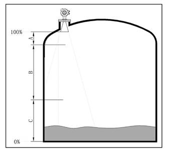 1. 測量范圍從波束觸及罐低的那一點開始計算,但在特殊情況下,若罐低為凹型或錐形,當(dāng)物位低于此點時無法進(jìn)行測量。