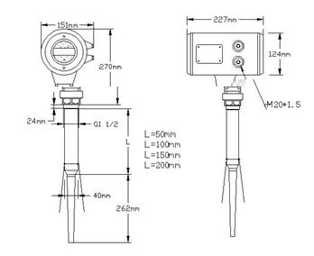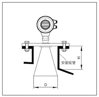 2. 如果喇叭直徑大于安裝短管的直徑,包括延伸管在內(nèi)的天線需要從容器里面安裝,并將儀表抬高。選擇延伸管使儀表至少抬高100mm。