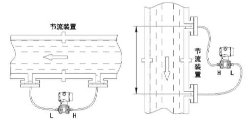 對不能用導(dǎo)壓管引出的介質(zhì),可用雙法蘭差壓變送器進行流量測量,其裝置見下圖,測量水平管道時,兩法蘭同在一水平面上,不存在液位差,不考慮遷移,測量垂直管道是,始終承受(r-r0)H的液位壓差故儀表應(yīng)有(r-r0)H正遷移量。