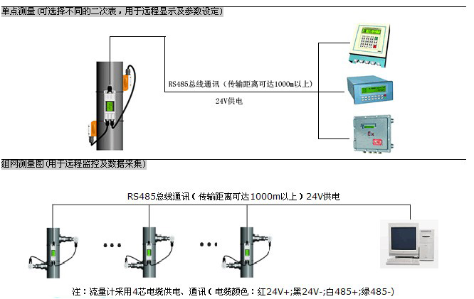 一次表與二次表(或計(jì)算機(jī))之間采用RS-485總線通訊,采用普通電纜即可,傳輸距離可達(dá)1000米以上,組網(wǎng)十分方便、快捷。這種傳輸方式抗干擾能力好,解決了分體式超聲波流量計(jì)專用電纜成本高、抗干擾能力差、傳輸距離短等問題。