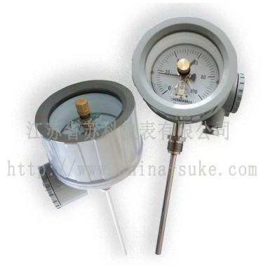 防爆電接點雙金屬溫度計帶有電接觸裝置—即機(jī)械電接點。當(dāng)被測介質(zhì)溫度變化時,自由端上的細(xì)軸及轉(zhuǎn)向傳動機(jī)構(gòu)帶動指針及動觸點轉(zhuǎn)動,在標(biāo)度盤上指示出溫度的變化值,當(dāng)其與定觸點(上、下限定觸點)接觸或斷開的瞬時,使電路系統(tǒng)中的繼電器及接觸器動作,以達(dá)到自動控制和報警的目的。 WSSX系列防爆電接點雙金屬溫度計是利用繞制成螺旋管狀的雙金屬片一端被固定,另一自由端與指針連接,隨著溫度的變化而轉(zhuǎn)動,并帶動指針旋轉(zhuǎn)指示溫度的單針式指示溫度計。是石油,焦化,化工,醫(yī)藥等企業(yè)生產(chǎn)現(xiàn)場存在碳化物等爆炸物各過程中的-80~+500℃范圍內(nèi)液體、蒸汽和氣體介質(zhì)以及固體表面的溫度測量。